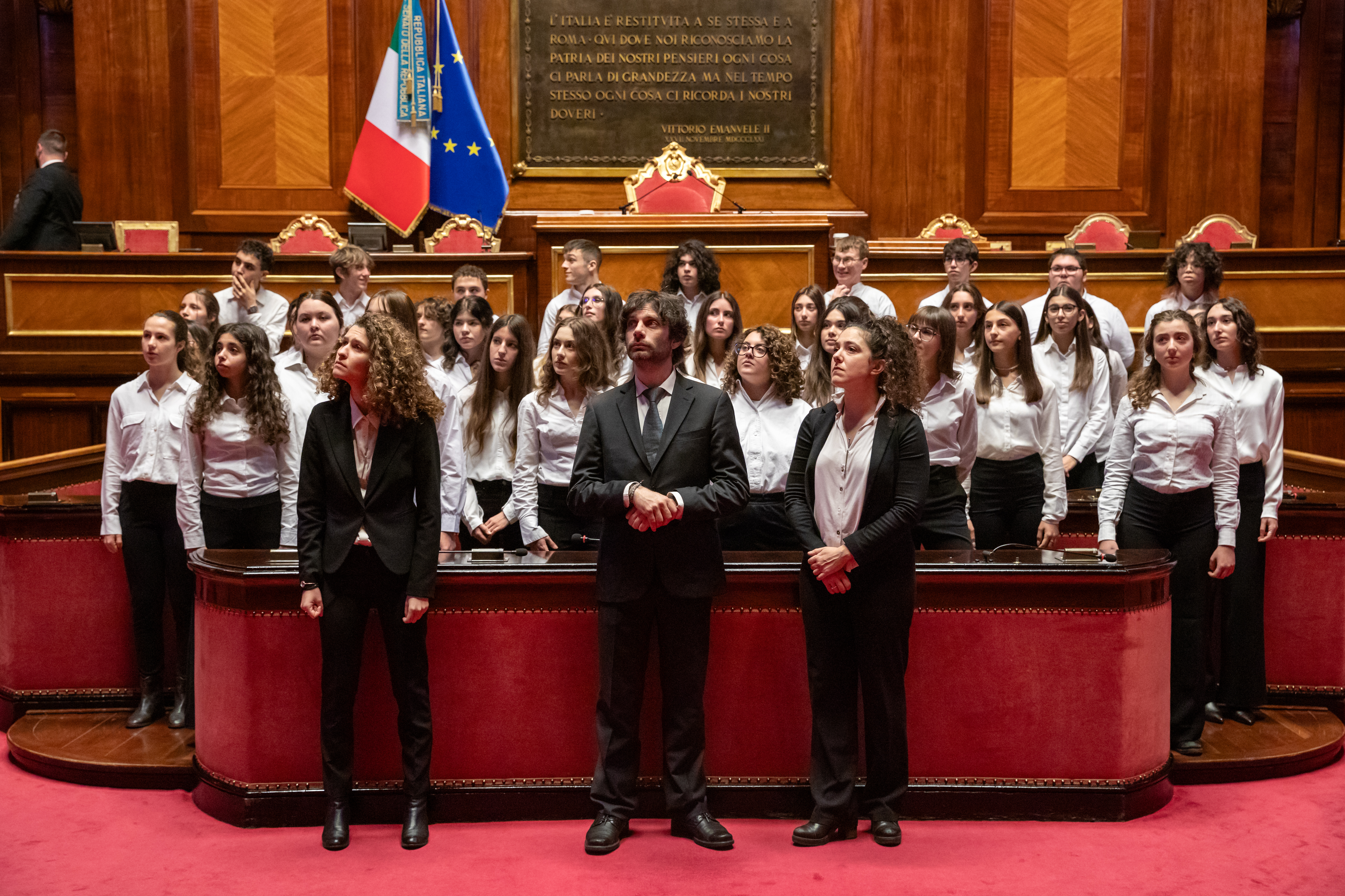 La seduta, popolata da circa 300 studenti, docenti e dirigenti di ogni parte d’Italia, si è aperta con l'Inno nazionale, cantato dal coro del Liceo Terenzio Mamiani di Roma. A presiedere il Presidente del Senato sen. Ignazio La Russa, accompagnato dai Vice Presidenti senatori Gian Marco Centinaio e Maria Domenica Castellone.