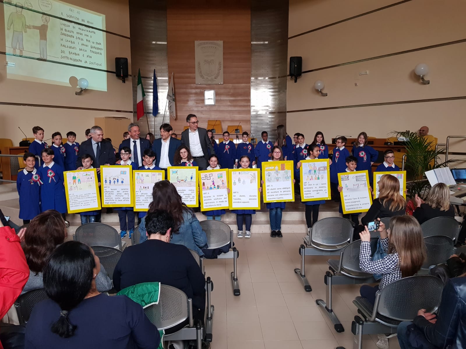 L'incontro, che si è aperto con l'Inno di Mameli intonato dal coro della scuola, si è svolto nella Sala consiliare di San Donaci (Brindisi). Dopo dei brevi saluti introduttivi rivolti da: il Dirigente scolastico, Antonio De Blasi, il sindaco di San Donaci, Angelo Marasco, il sen. Romano e il sen. Stefano, i bambini hanno illustrato, parlando a turno e con l'ausilio di un powerpoint e di cartelloni illustrati, il progetto vincitore spiegandone il processo di realizzazione e il lavoro svolto in classe. I senatori si sono congratulati con i ragazzi e i docenti non soltanto per la qualità dell'elaborato prodotto ma anche per l'originalità nella scelta del tema e l'approfondimento e, nel contempo, la valorizzazione, del ruolo degli anziani nella nostra società.